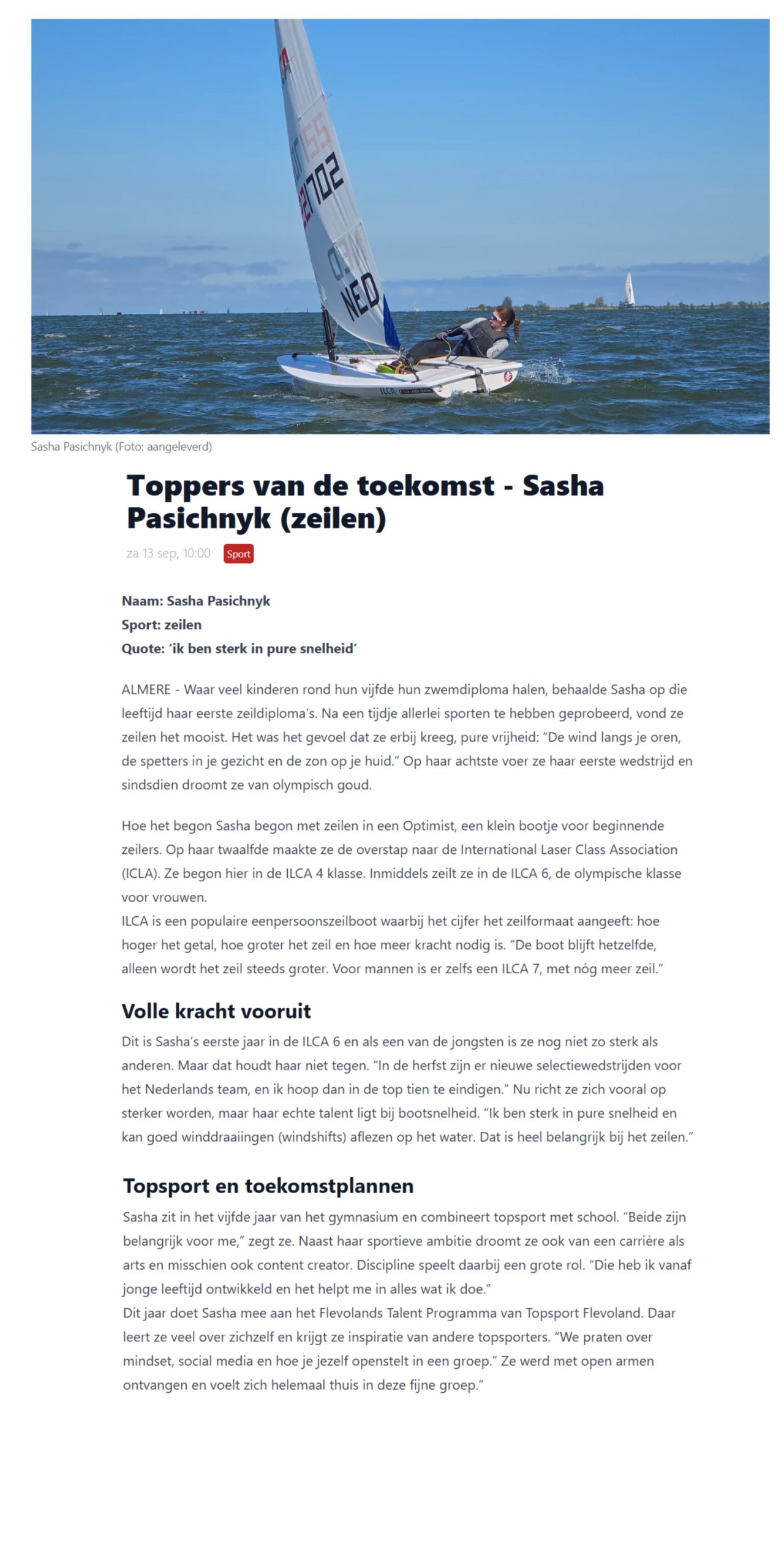 Sasha begon met zeilen in een Optimist, een klein bootje voor beginnende zeilers. Op haar twaalfde maakte ze de overstap naar de International Laser Class Association (ICLA). Ze begon hier in de ILCA 4 klasse. Inmiddels zeilt ze in de ILCA 6, de olympische klasse voor vrouwen. Haar grote droom? Olympisch goud!