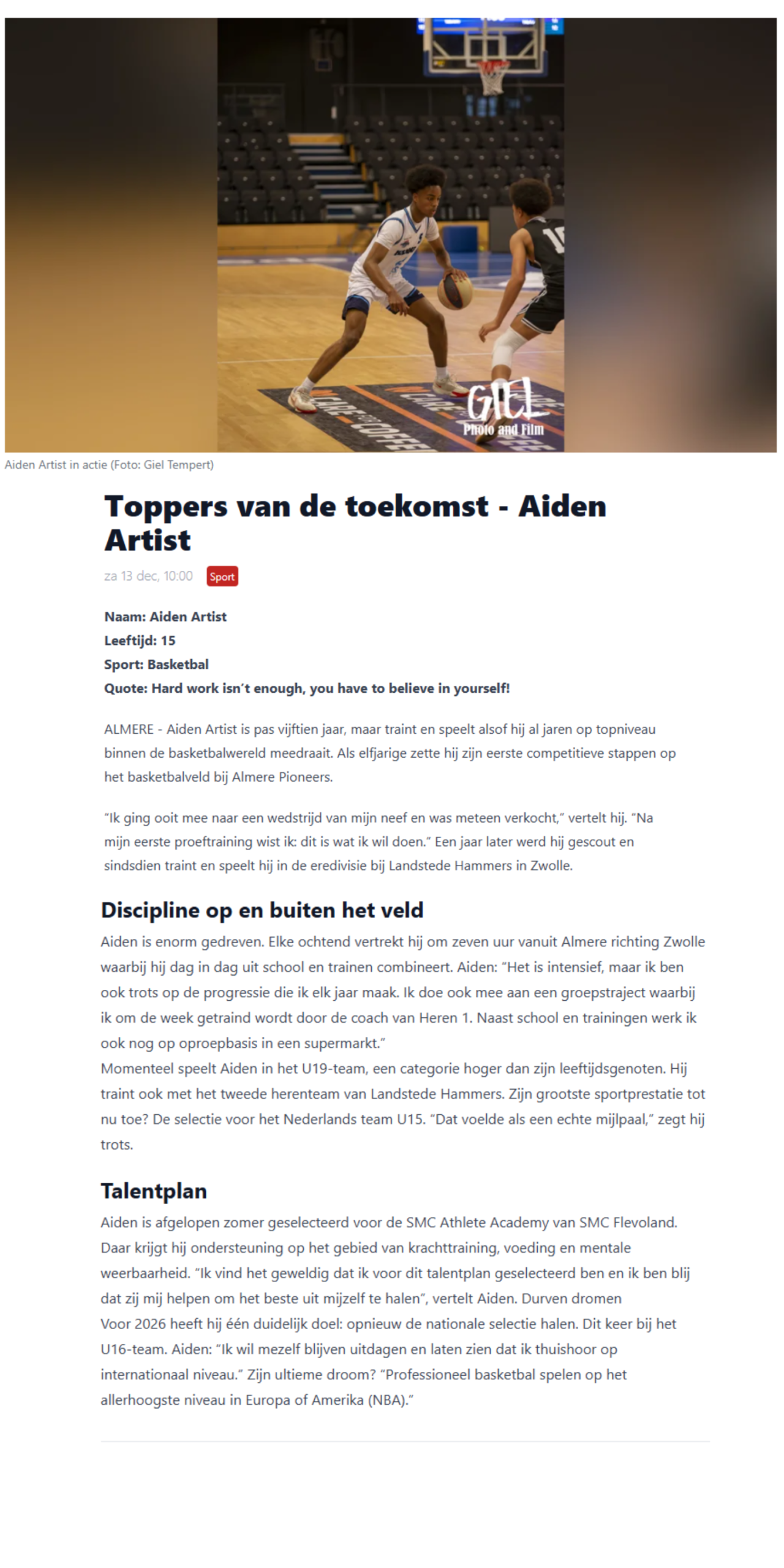 Aiden ging ooit mee naar een wedstrijd van mijn neef en was meteen verkocht. “Na mijn eerste proeftraining wist ik: dit is wat ik wil doen.” Zodoende zette hij als elfjarige zijn eerste competitieve stappen op het basketbalveld bij Almere Pioneers. Een jaar later werd hij gescout en sindsdien traint en speelt hij in de eredivisie bij Landstede Hammers in Zwolle.