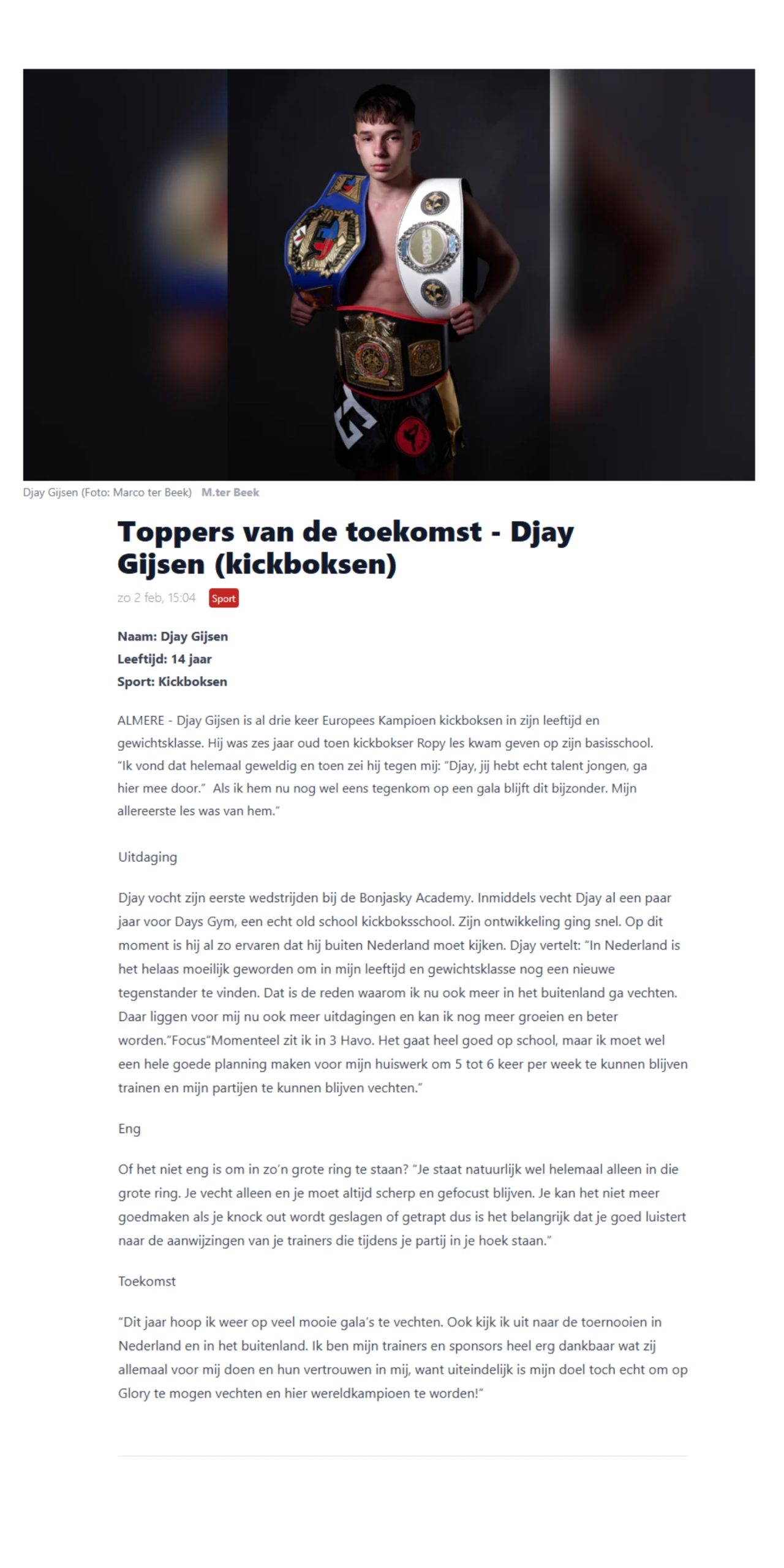 Djay Gijsen is al drie keer Europees Kampioen kickboksen in zijn leeftijd en gewichtsklasse. Hij was zes jaar oud toen kickbokser Ropy les kwam geven op zijn basisschool, Ropy herkende het talent van Djay en inspireerde hem om er wat mee te gaan doen.