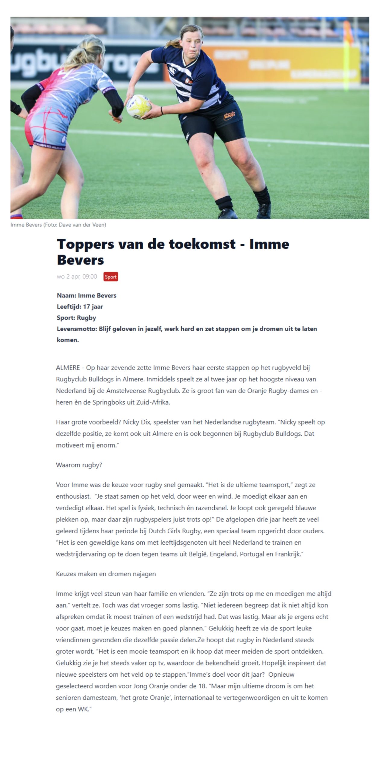 Op haar zevende zette Imme Bevers haar eerste stappen op het rugbyveld bij Rugbyclub Bulldogs in Almere en afgelopen week kwam het mooie nieuws dat Imme opnieuw geselecteerd is voor de trainingsselectie van Jong Oranje. Daarmee is ze weer een stapje dichter bij haar grote droom om het grote Oranje te vertegenwoordigen op een WK!