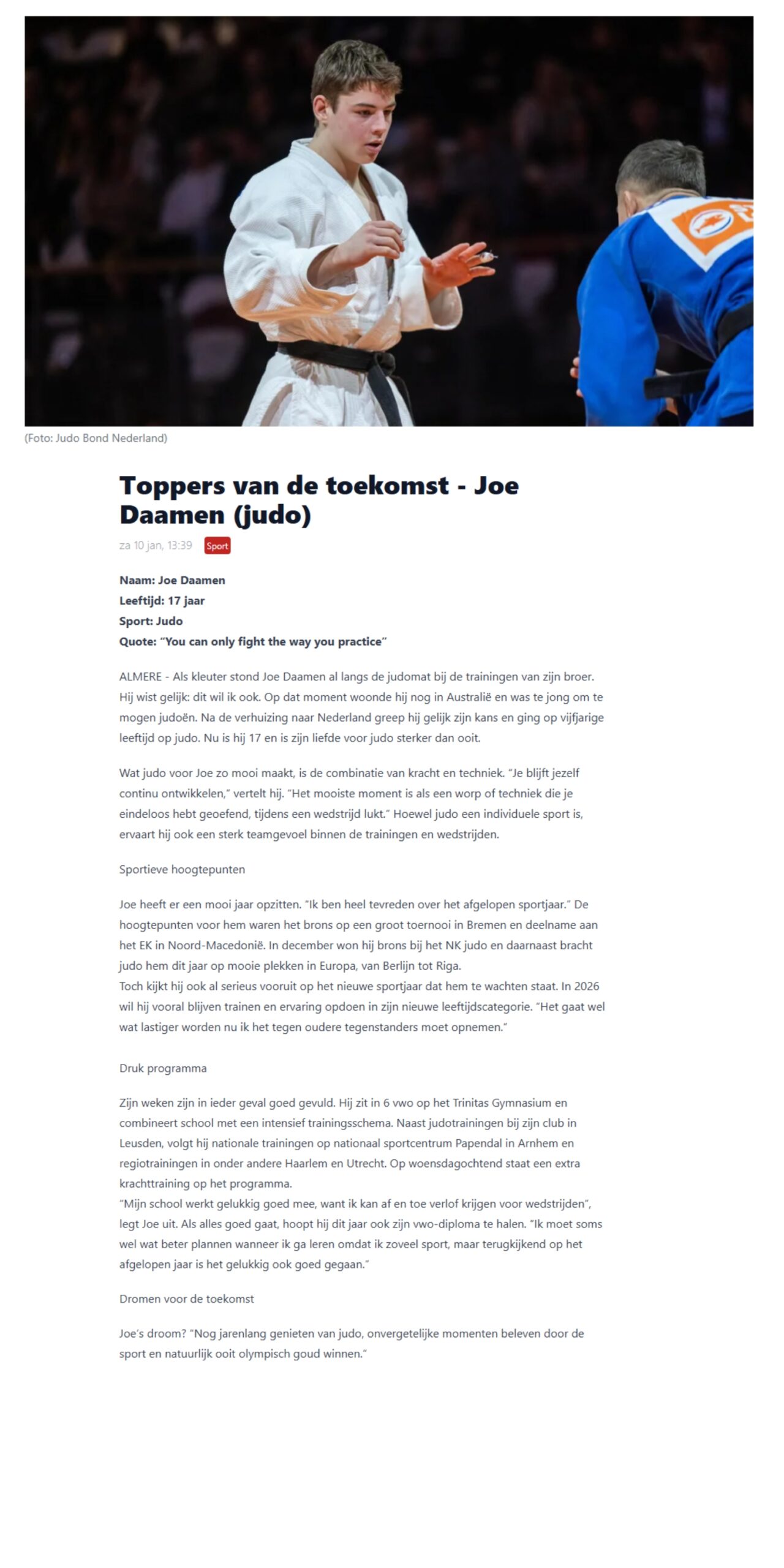 Joe Daamen sloot 2025 af met een mooie bronzen medaille op het NK judo. Inmiddels heeft hij zijn blik alweer gericht op zijn nieuwe doelen. In 2026 wil hij vooral blijven trainen en ervaring opdoen in zijn nieuwe leeftijdscategorie. Joe’s droom? “Nog jarenlang genieten van judo, onvergetelijke momenten beleven door de sport en natuurlijk ooit olympisch goud winnen.”