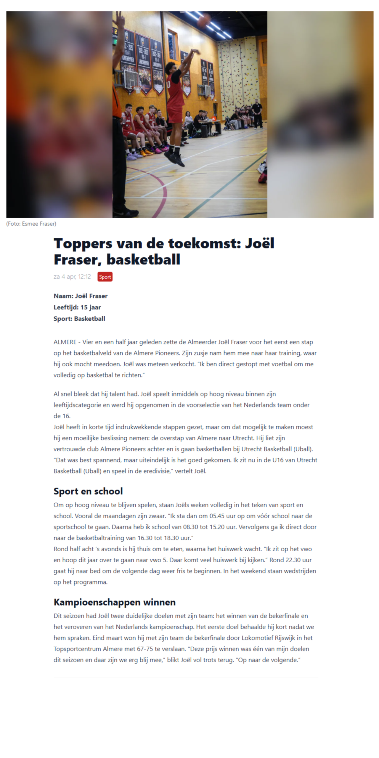 Joëls weken staan volledig in het teken van sport en school en niet zonder succes! Eind maart won hij met zijn team de bekerfinale door Lokomotief Rijswijk in het Topsportcentrum Almere met 67-75 te verslaan. “Deze prijs winnen was één van mijn doelen dit seizoen en daar zijn we erg blij mee,” blikt Joël vol trots terug.