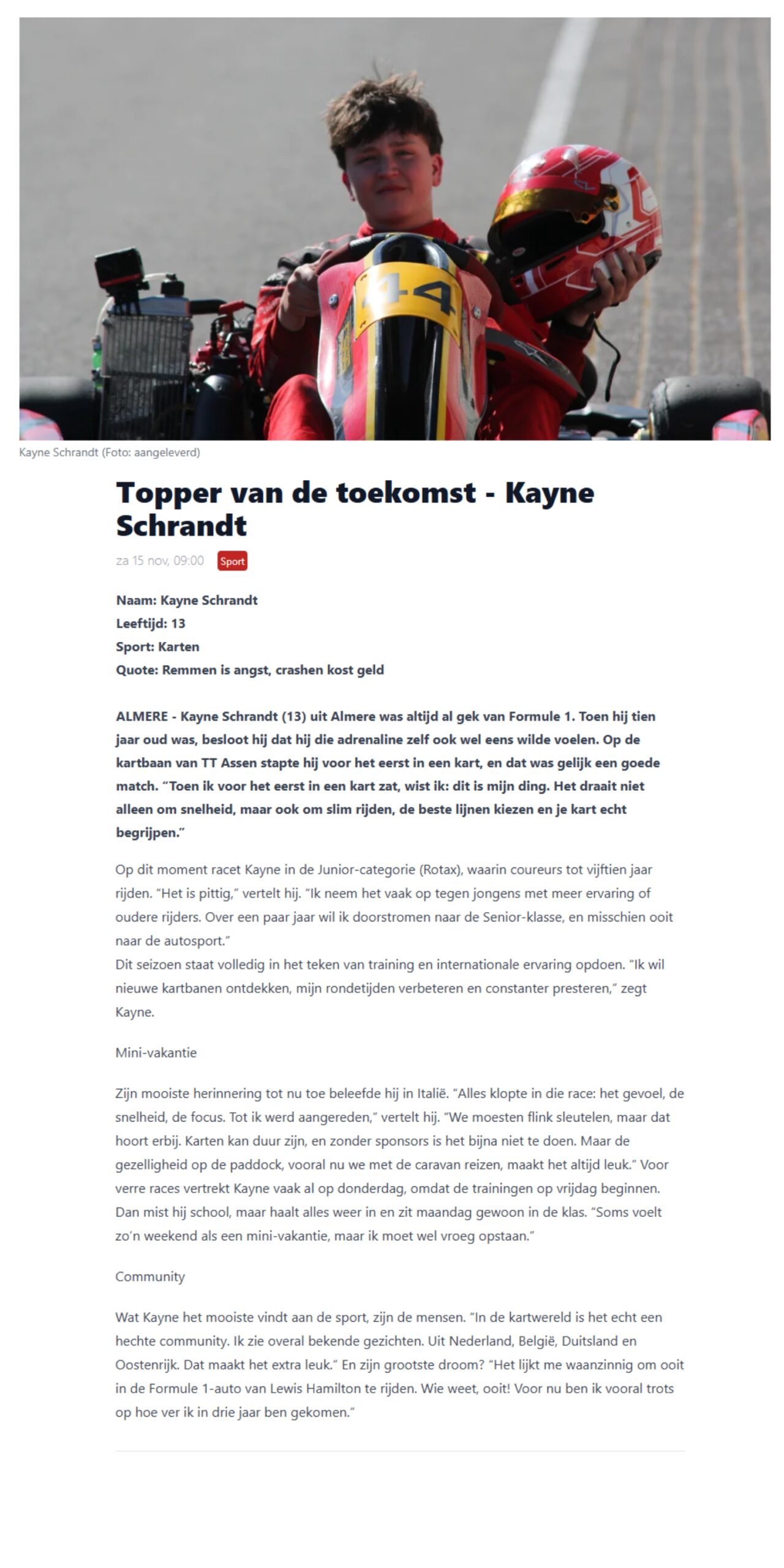“Toen ik voor het eerst in een kart zat, wist ik: dit is mijn ding. Het draait niet alleen om snelheid, maar ook om slim rijden, de beste lijnen kiezen en je kart echt begrijpen.”