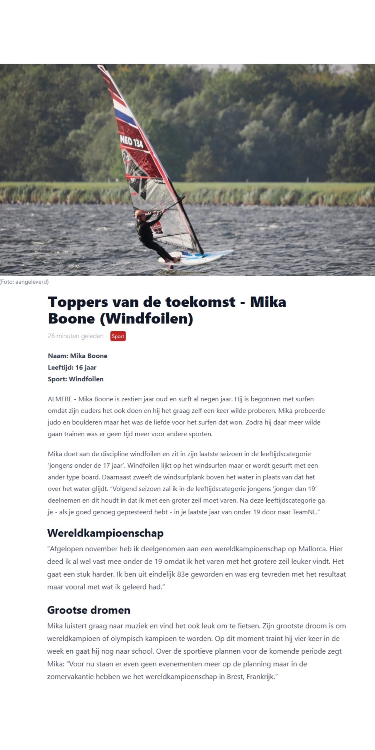 Mika’s grootste droom is om wereldkampioen of olympisch kampioen te worden. Op dit moment traint hij vier keer in de week en gaat hij nog naar school in Almere. Maak kennis met windfoiler Mika Boone.