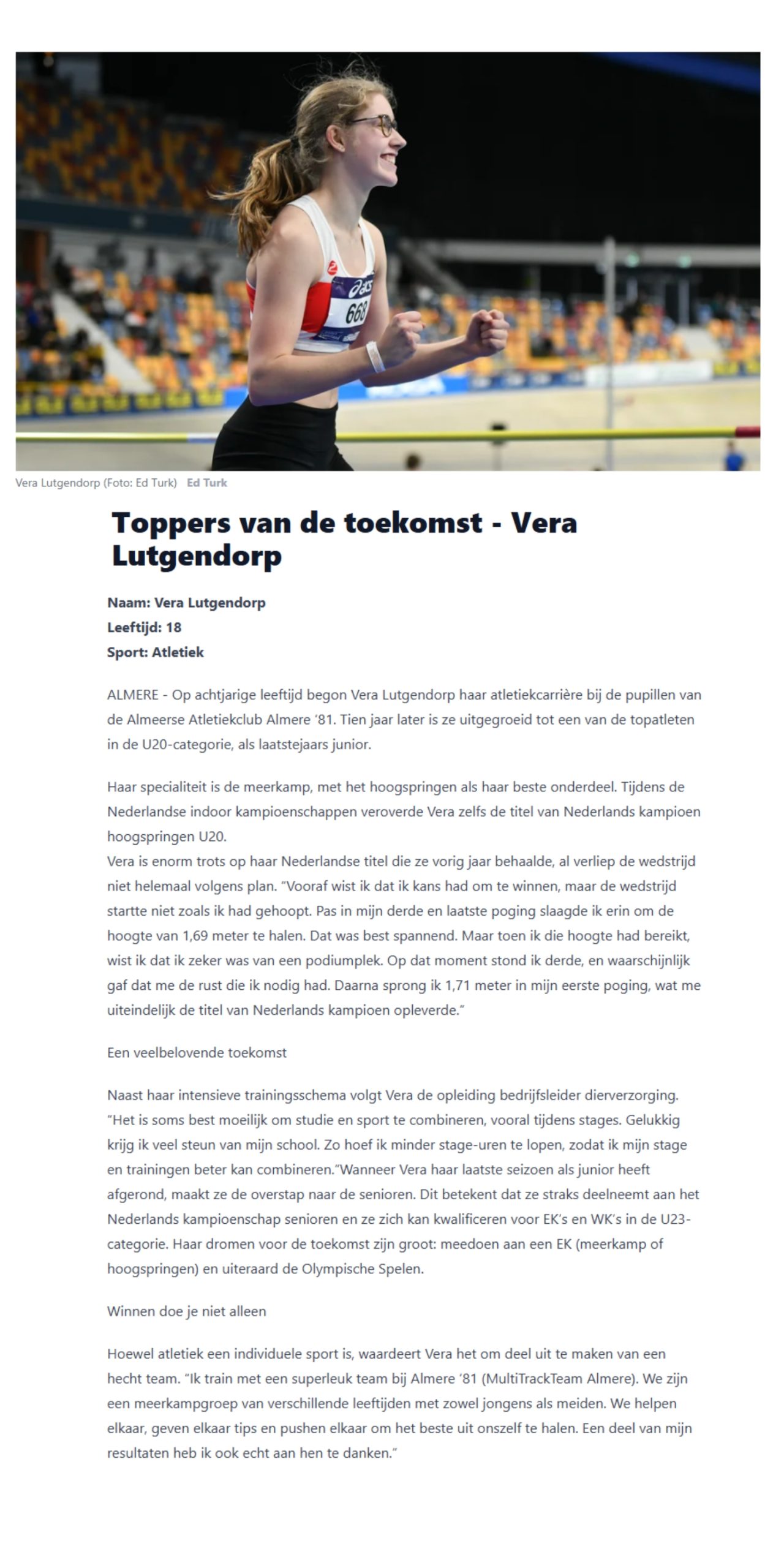 Op achtjarige leeftijd begon Vera Lutgendorp haar atletiekcarrière bij de pupillen van de Almeerse Atletiekclub Almere ‘81. Tien jaar later is ze uitgegroeid tot een van de topatleten in de U20-categorie!