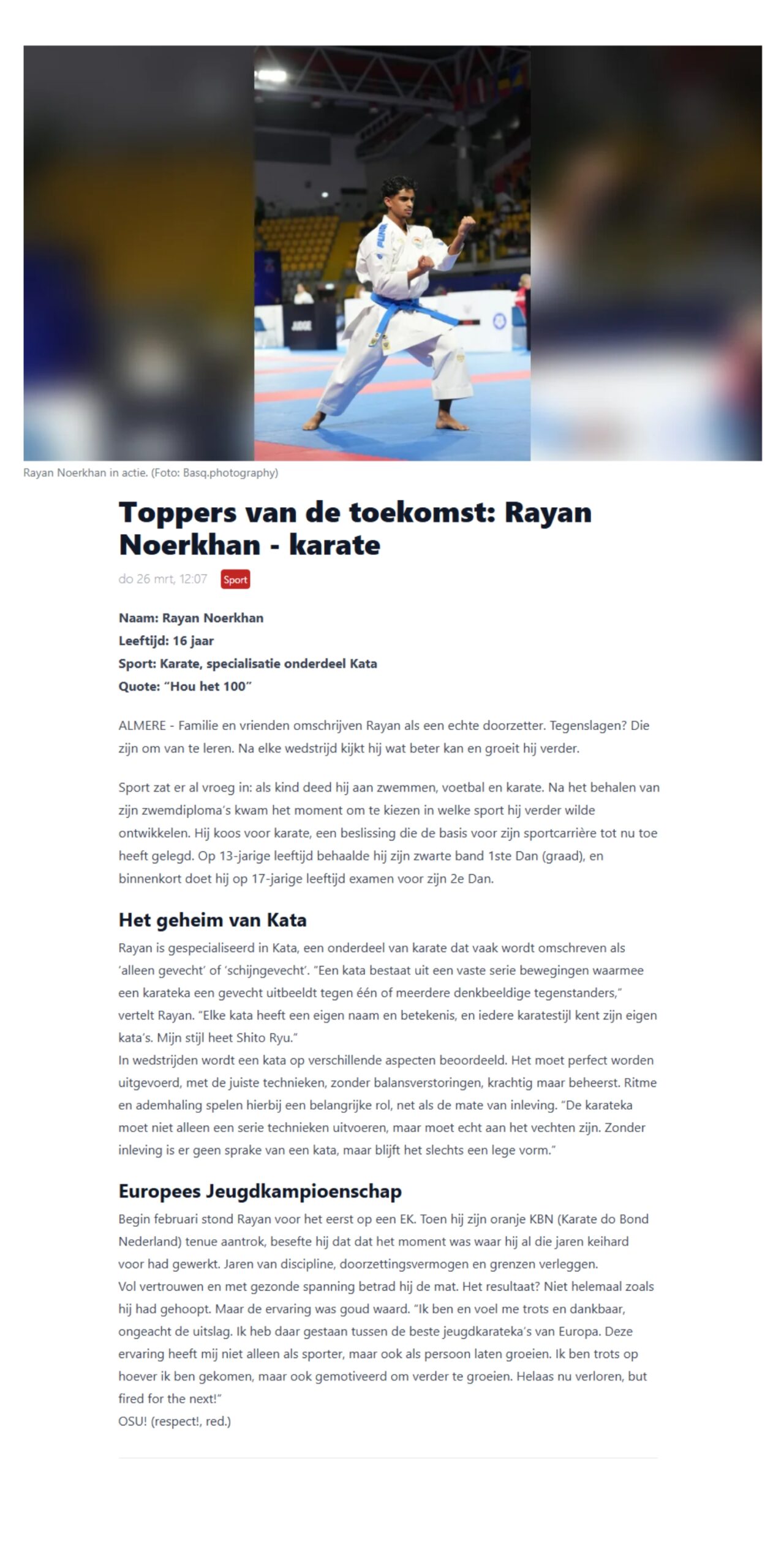 Rayan is gespecialiseerd in Kata, een onderdeel van karate dat vaak wordt omschreven als ‘alleen gevecht’ of ‘schijngevecht’. “Elke kata heeft een eigen naam en betekenis, en iedere karatestijl kent zijn eigen kata’s. Mijn stijl heet Shito Ryu,” vertelt Rayan. Vorige maand maakte hij zijn debuut op het Europees kampioenschap en onder andere daarover vertelt hij in dit interview.