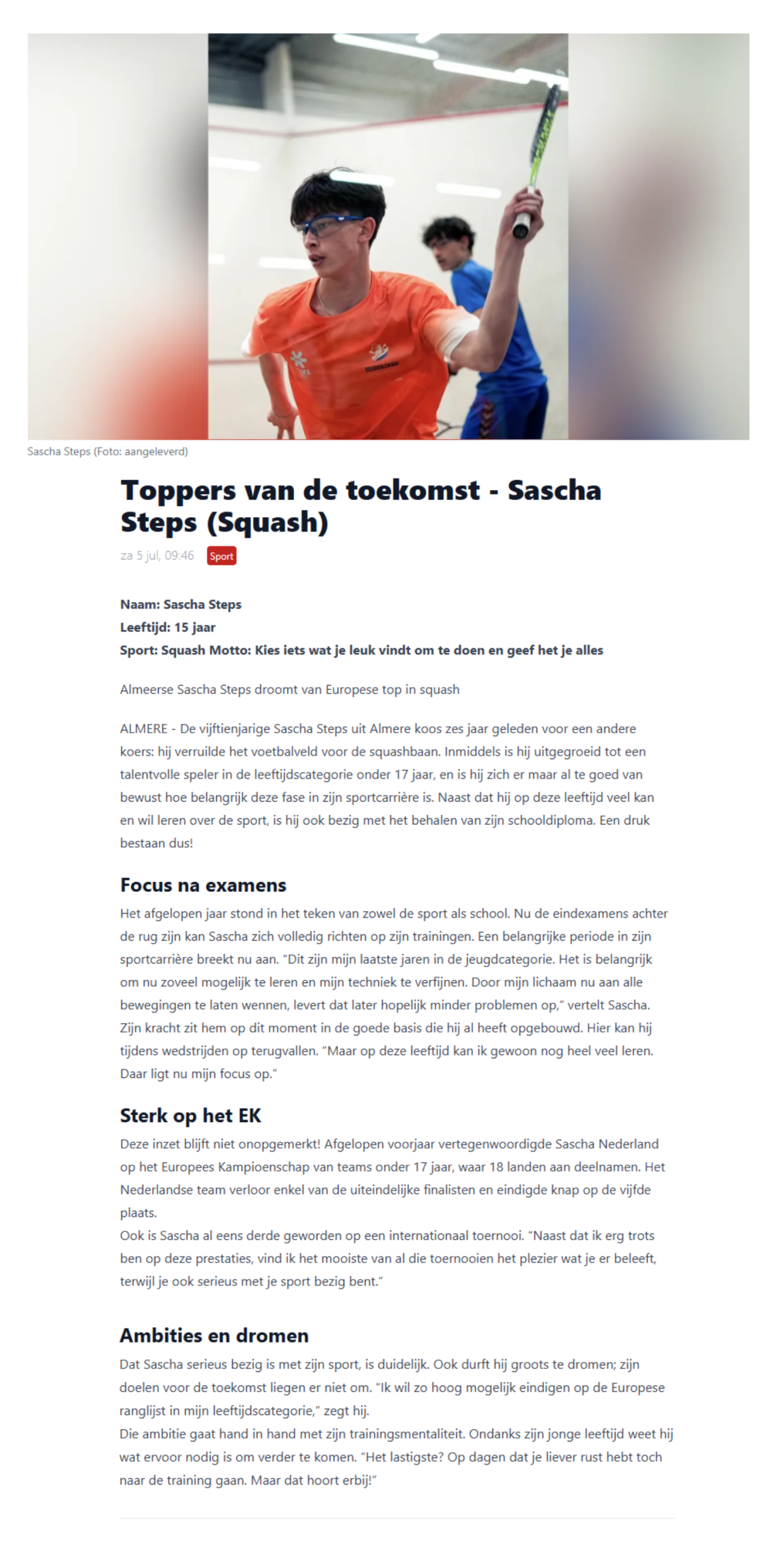 Dat Sascha serieus bezig is met zijn sport, is duidelijk. Hij durft groots te dromen en zijn doelen voor de toekomst liegen er niet om. “Ik wil zo hoog mogelijk eindigen op de Europese ranglijst in mijn leeftijdscategorie,” zegt hij.