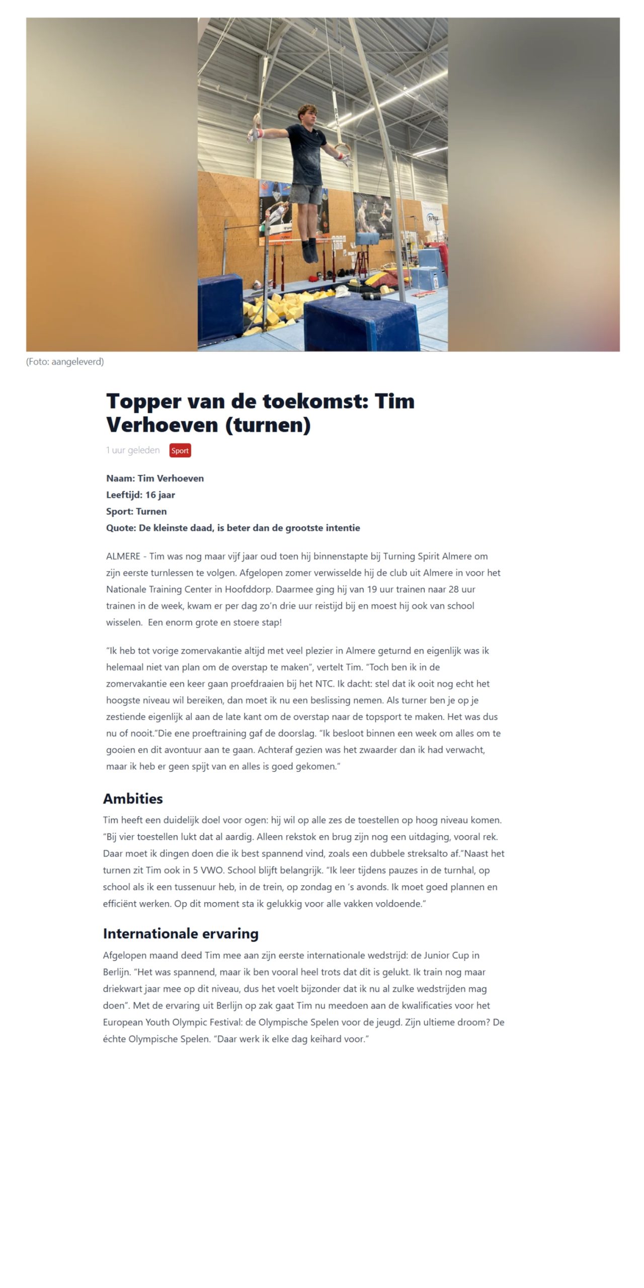Maak kennis met de Almeerse sporters! In samenwerking met de krant Almere deze Week stellen wij per jaar een aantal jonge Almeerse topsporters voor aan jullie voor. In de artikelen wordt ingegaan op het leven als sporttalent en topsporter. We vragen de sporters hoeveel ze trainen, of het te combineren is met school/werk en wat hun omgeving vindt van hun leven als topsporter.